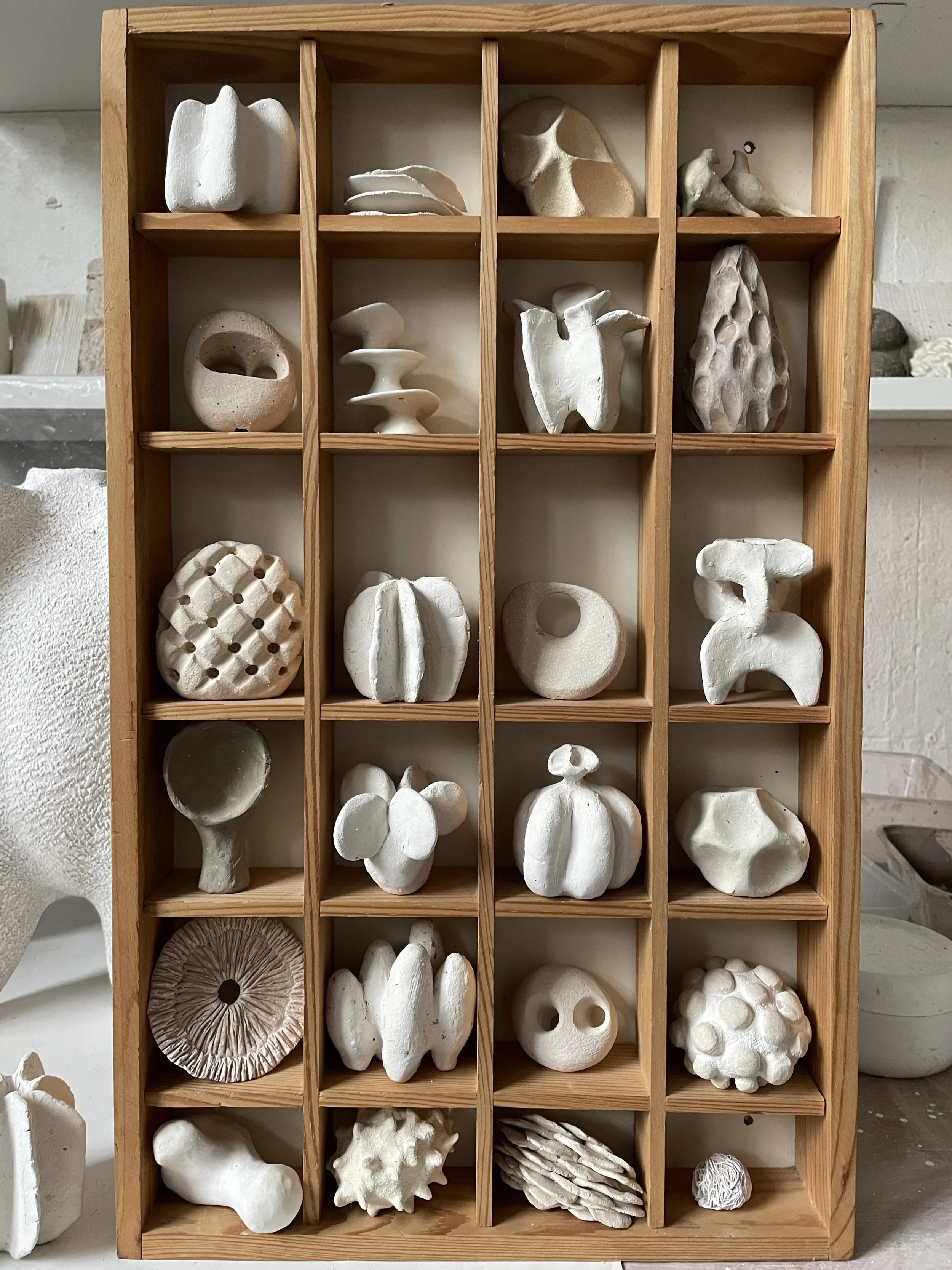 My handbuilt vessels are experiments in form and surface texture, pattern and composition. Every piece is a meditation on the variety and beauty of the natural world and my relationship with the materiality of clay. I study a particular form that interests me and create a series of unique hand built explorations that evolve whilst making.